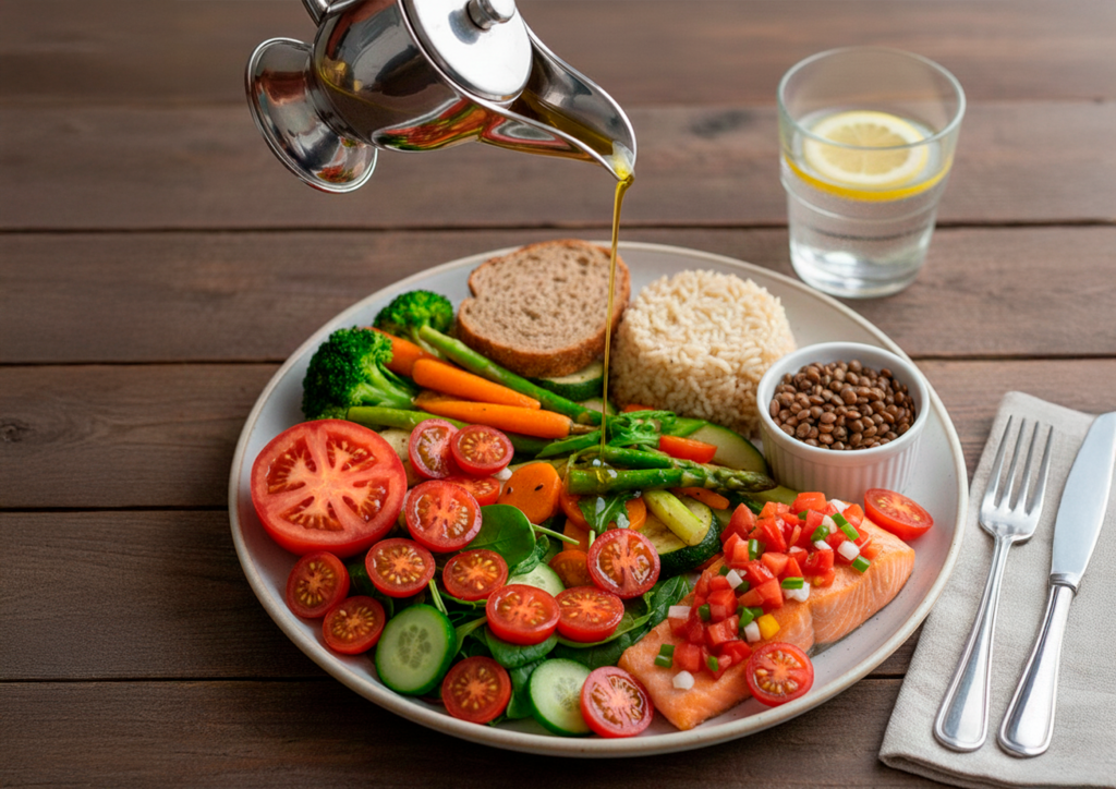- ¼ del plato: proteína de calidad (legumbres, huevos, pescado, pollo, etc.).